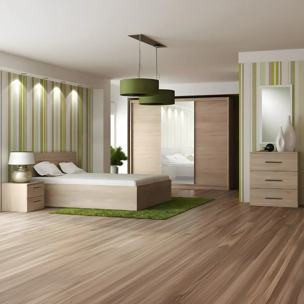 This elegant 4-piece bedroom set brings together natural warmth and modern functionality, crafted from durable MDF wood and rich musky wood accents. The set includes a sleek bed frame, a spacious sliding-door wardrobe with mirrored panels, a minimalist dressing table with mirror, and a compact chest of drawers for convenient storage.
