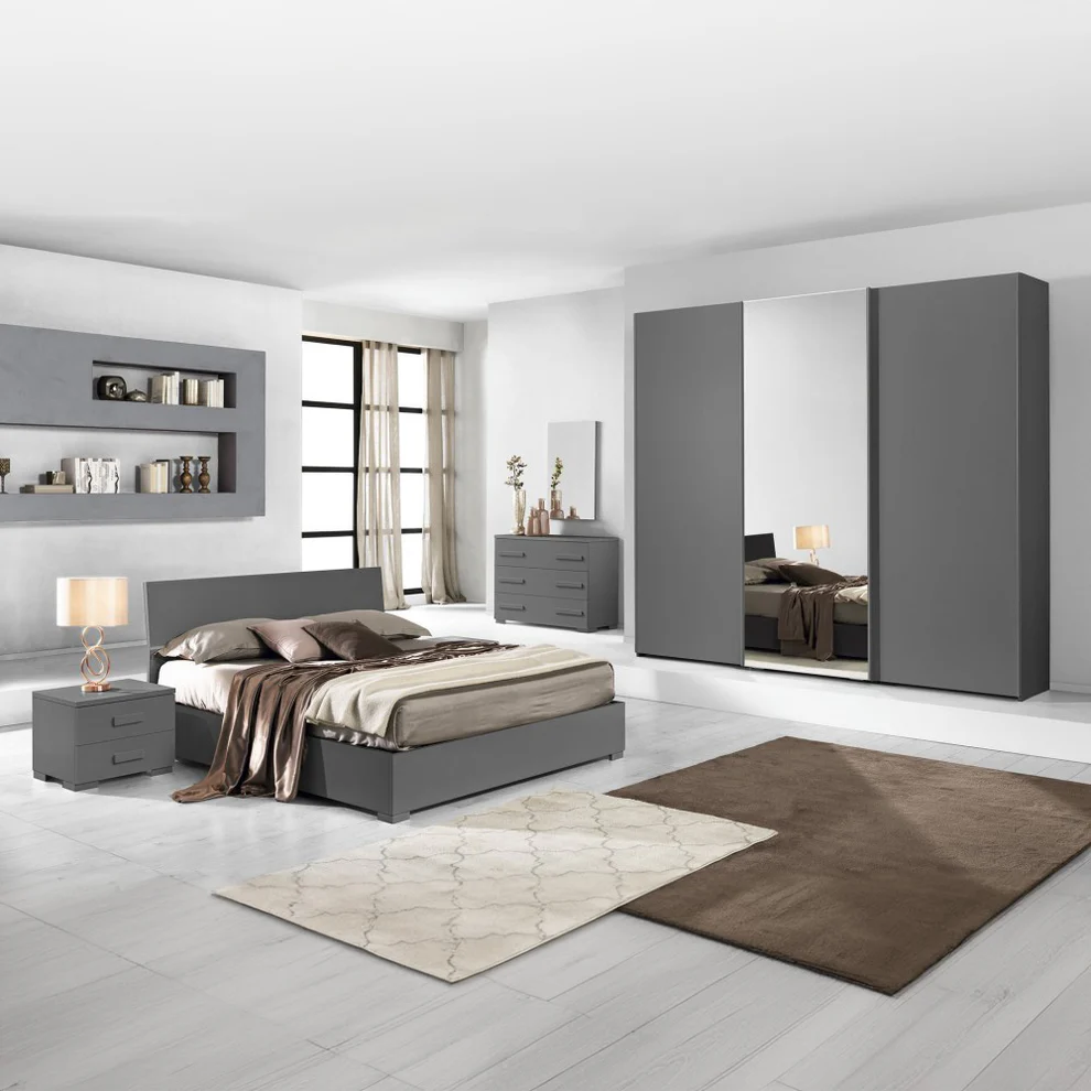The set includes a spacious bed frame, a large mirrored wardrobe, a functional dressing table with matching mirror, and a compact chest of drawers for everyday essentials. Its understated design and neutral tone make it easy to pair with various interior styles.
