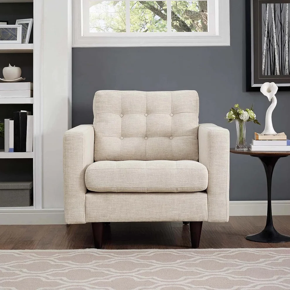 This elegantly tailored armchair combines a solid natural beech wood structure with high-density sponge cushioning for long-lasting comfort and support. Upholstered in soft plush fabric, it features a clean, button-tufted design that brings timeless sophistication to any living space. Ideal for contemporary homes, offices, or reading corners.