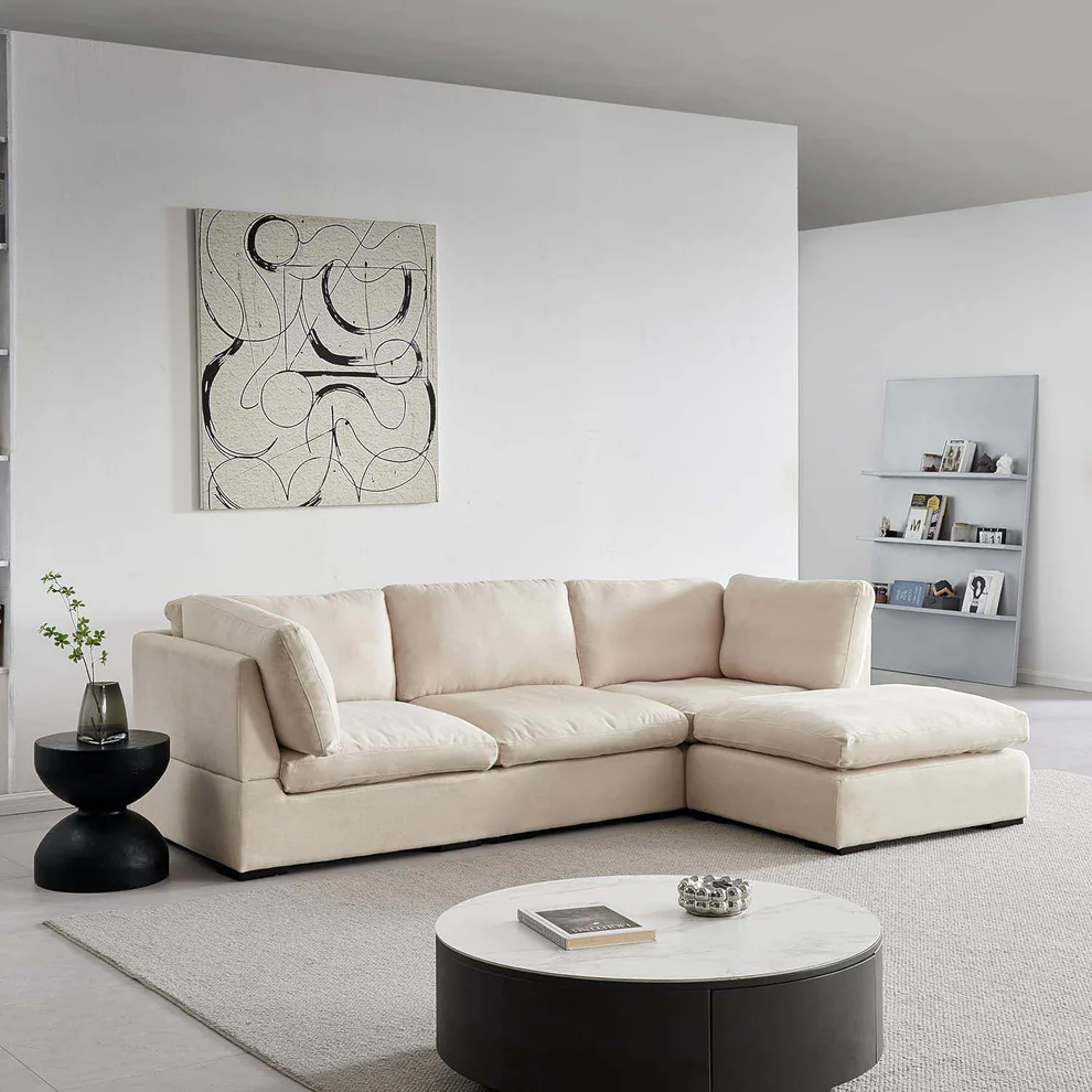 This corner sofa is expertly crafted using a combination of natural beech wood, soft sponge, linen fabric to ensure long-lasting comfort, structural integrity, and aesthetic appeal.